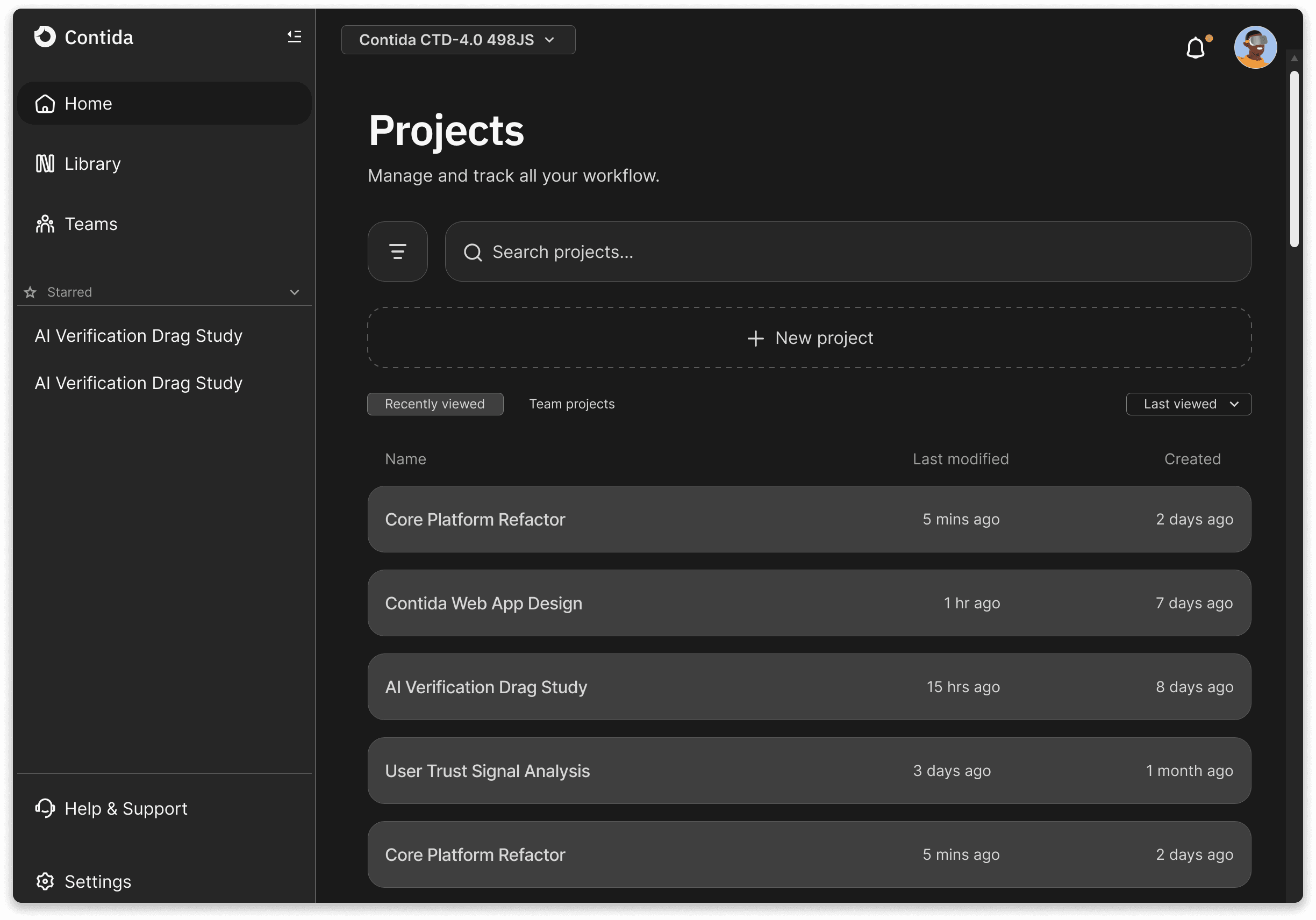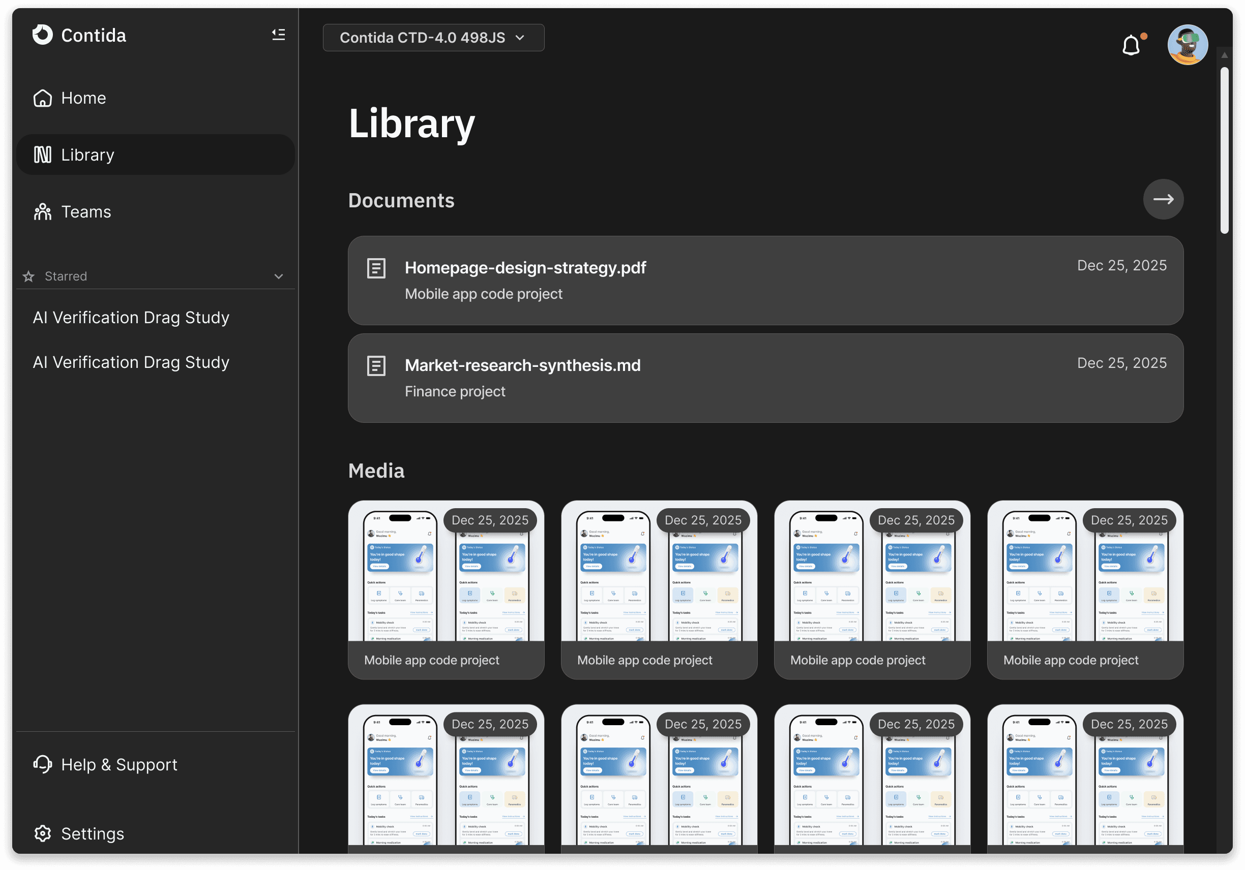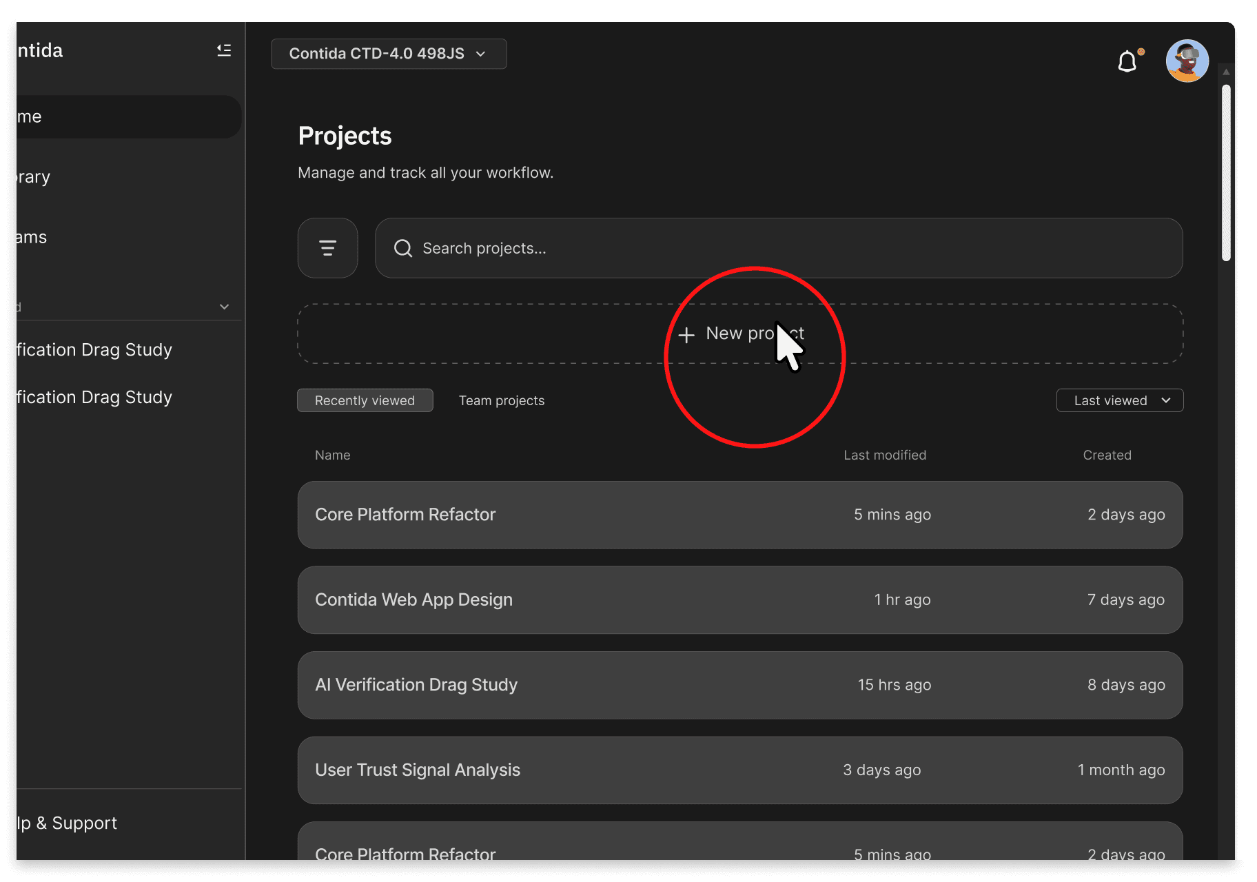 When users open Contida, they are not dropped into a blank conversation. They are presented with a list of projects โ ongoing and completed โ each representing a distinct body of work with its own context, constraints, and history.