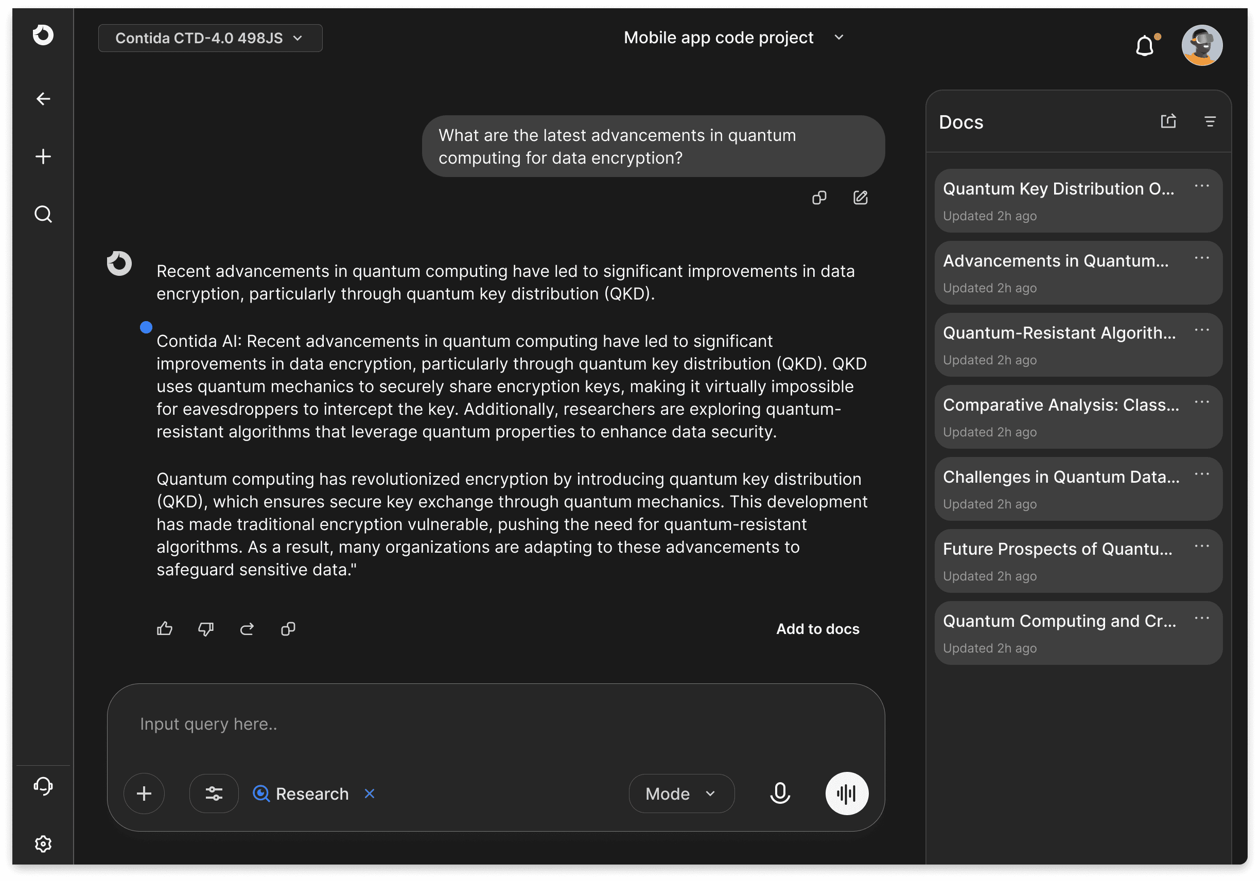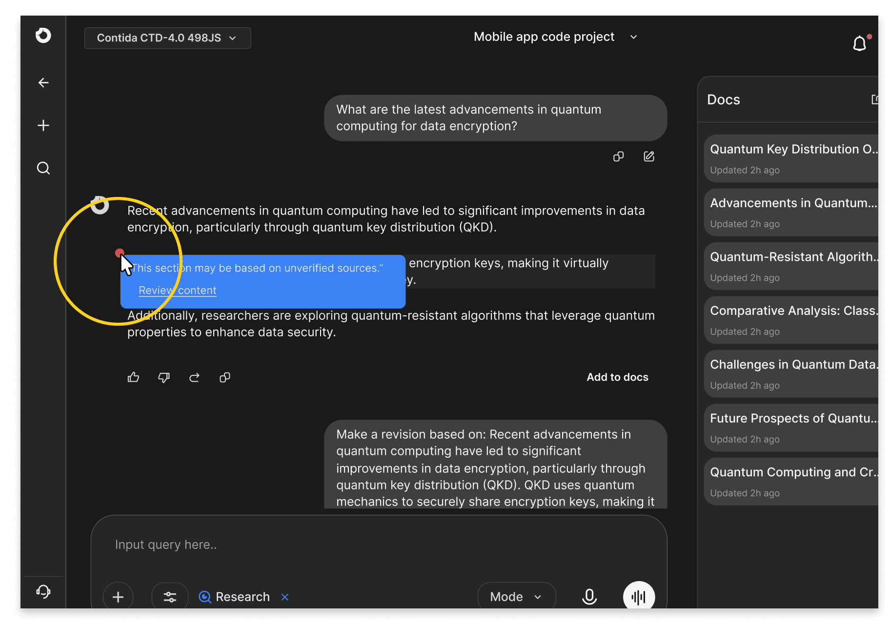 With project directives set, the user begins an ongoing research conversation.