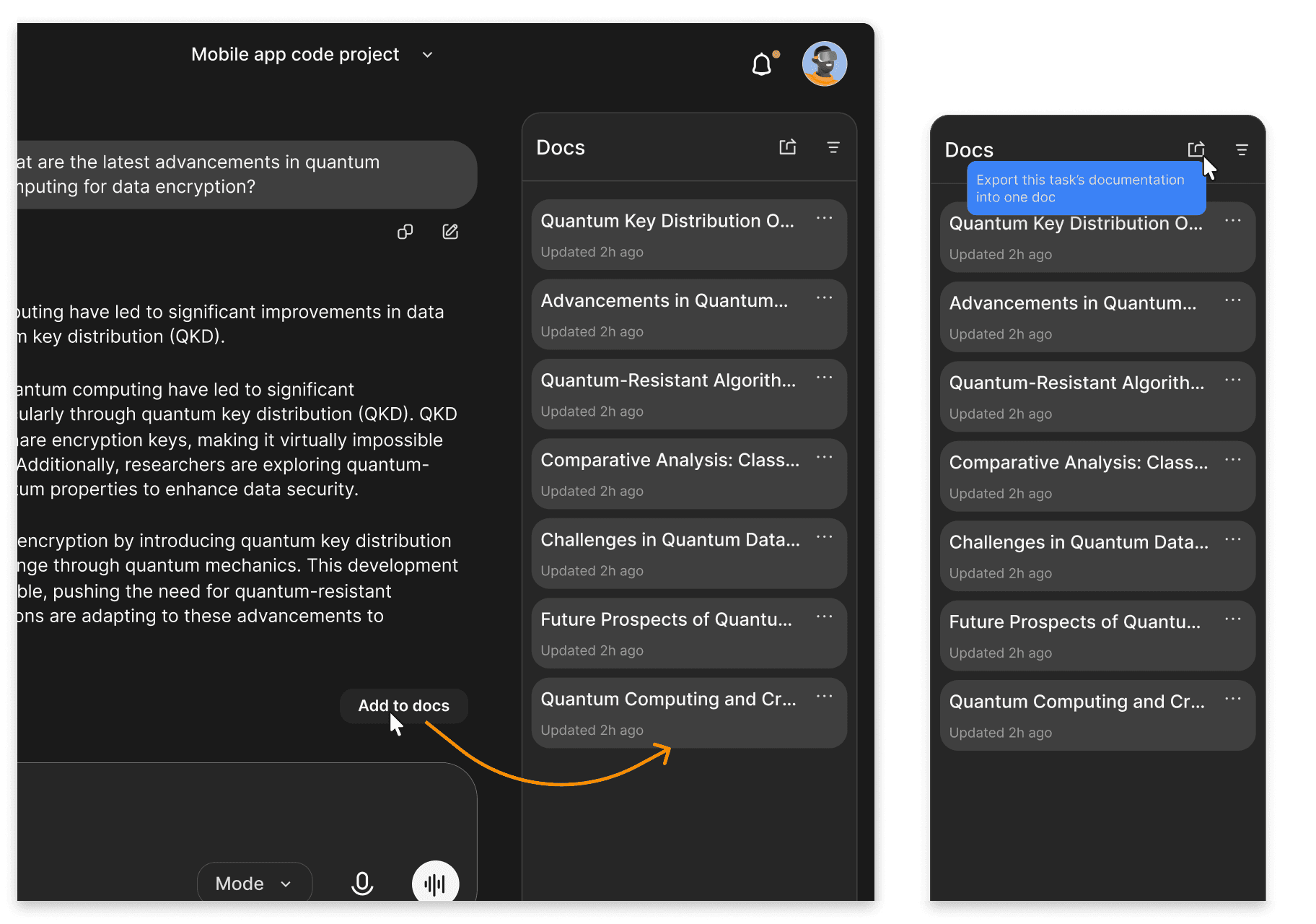 As the research progresses, reviewed outputs can be saved into documents โ turning transient conversation into structured work.