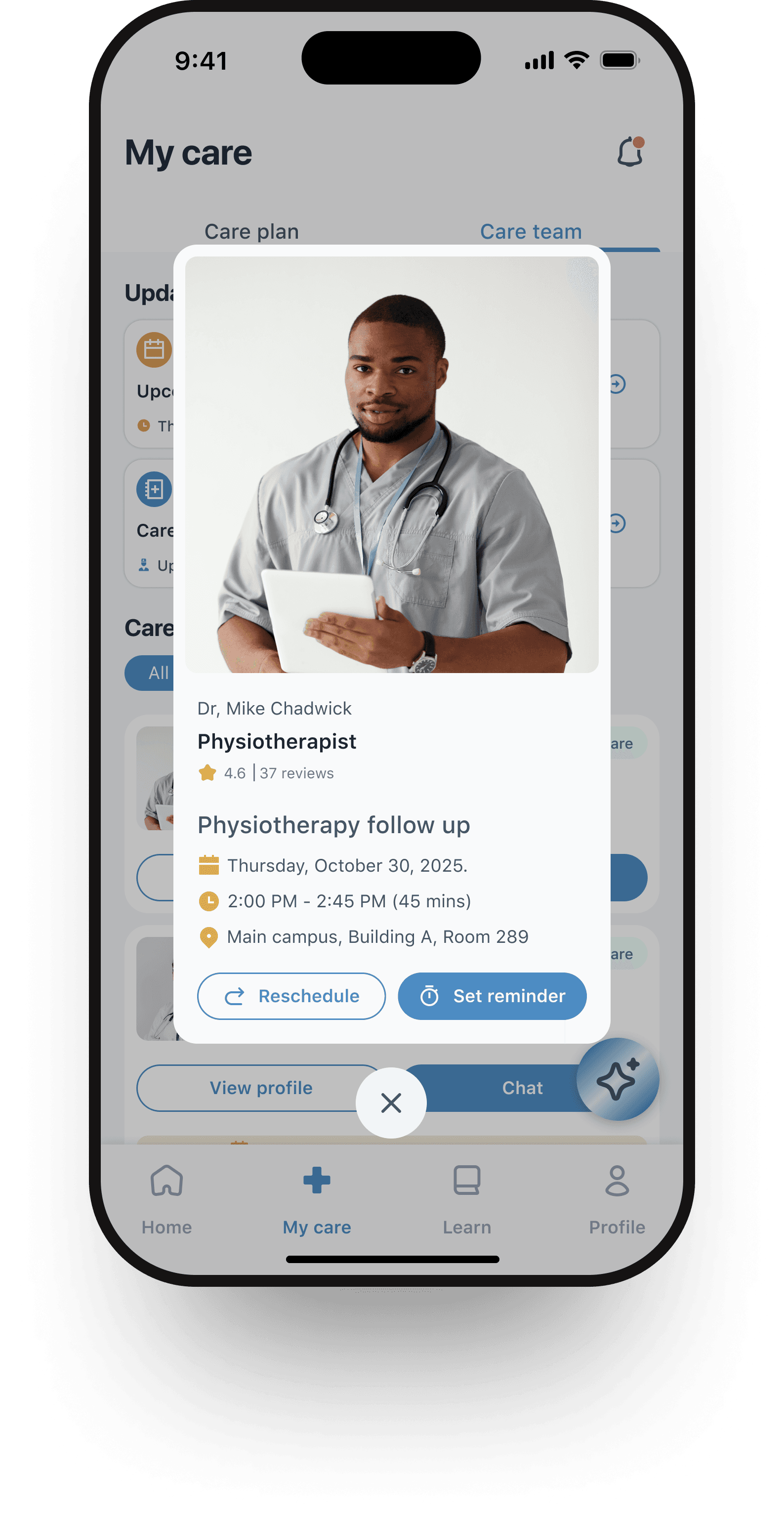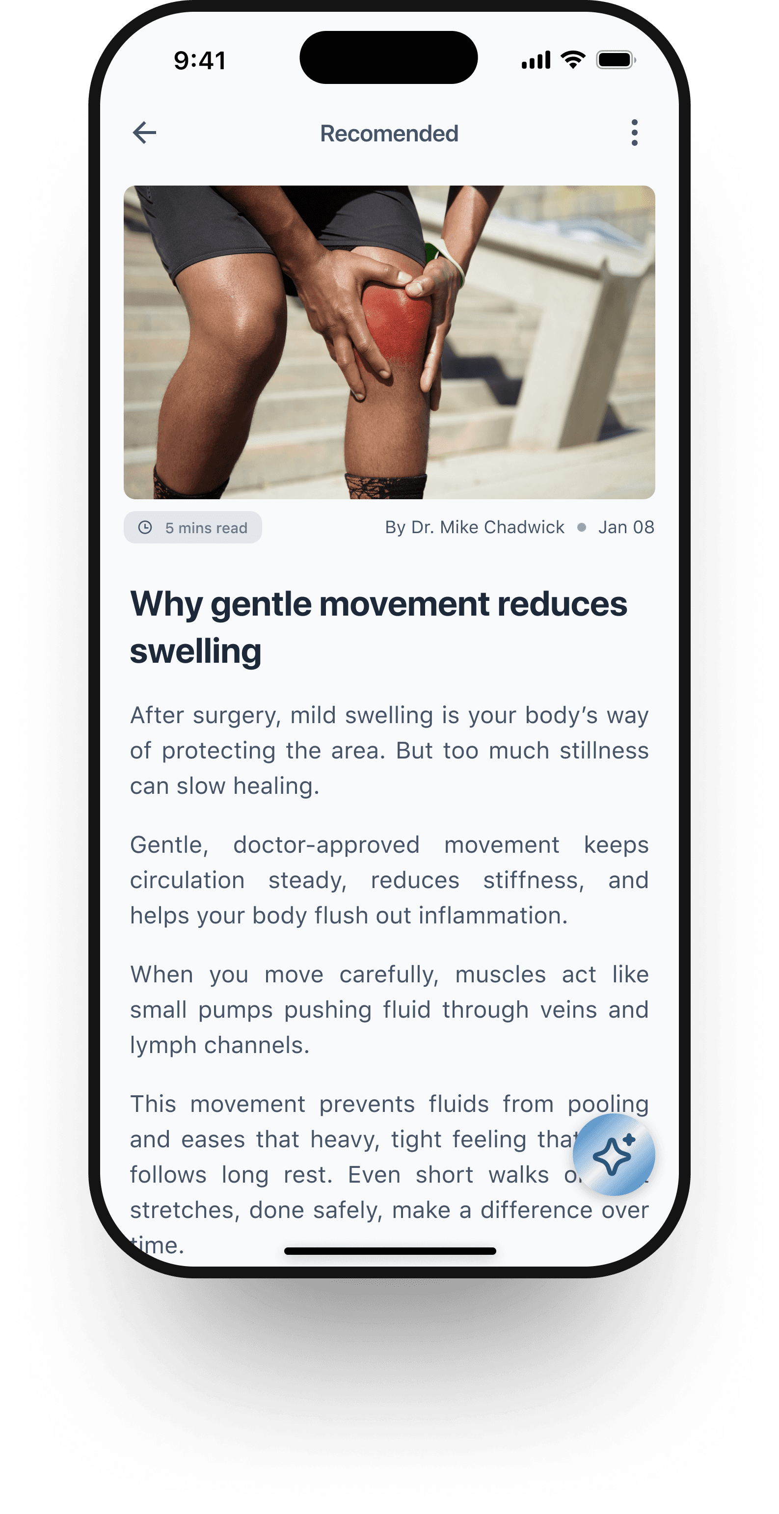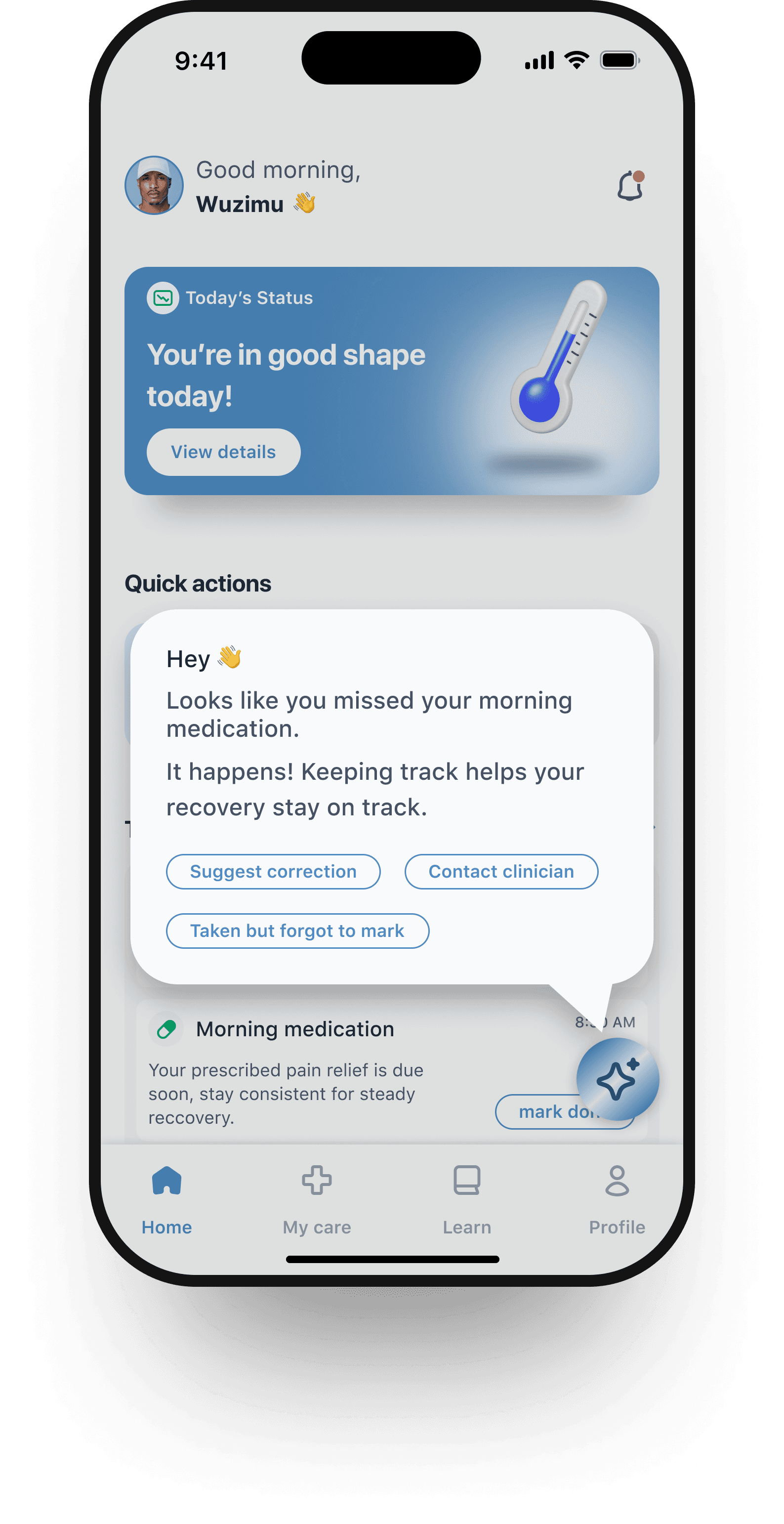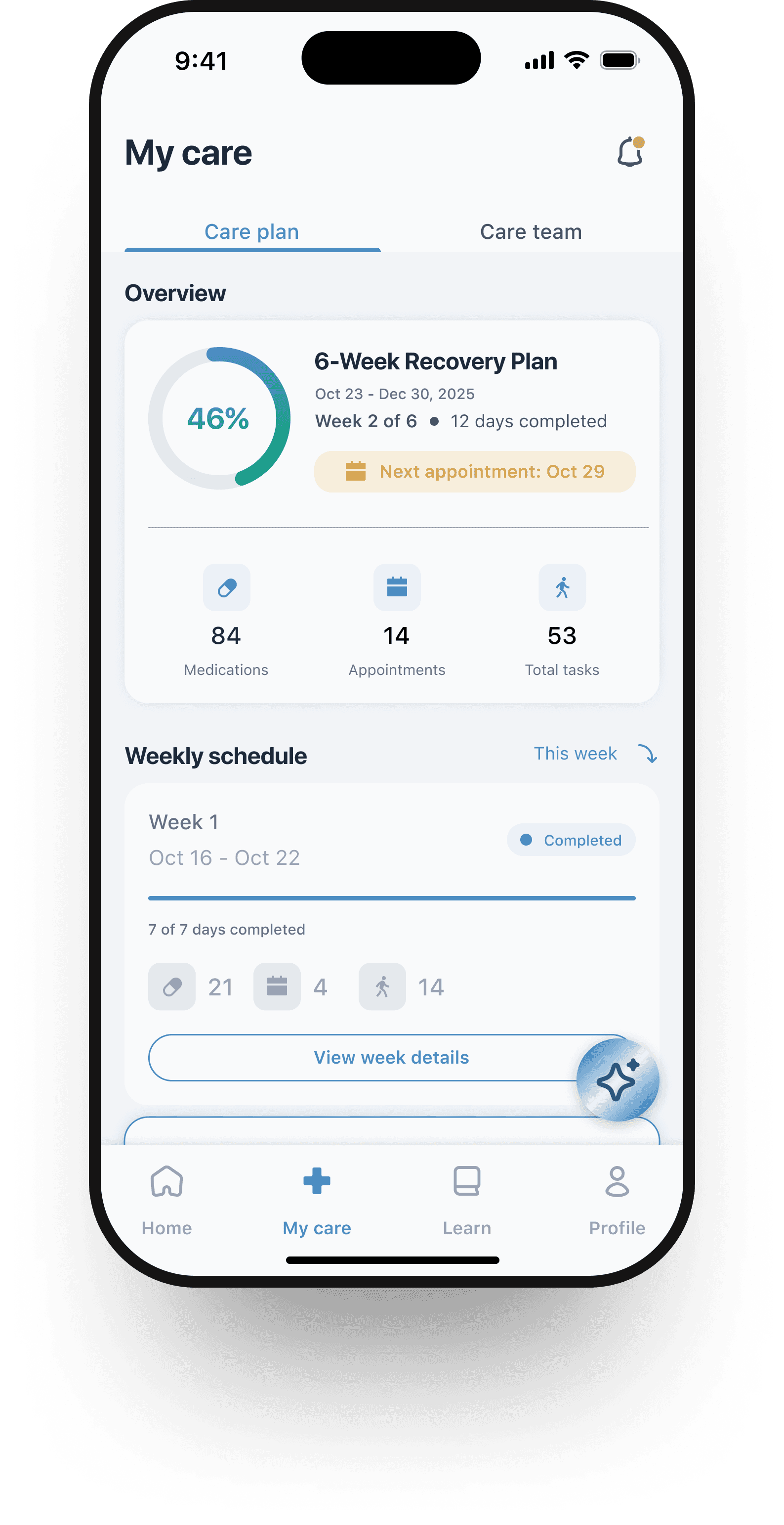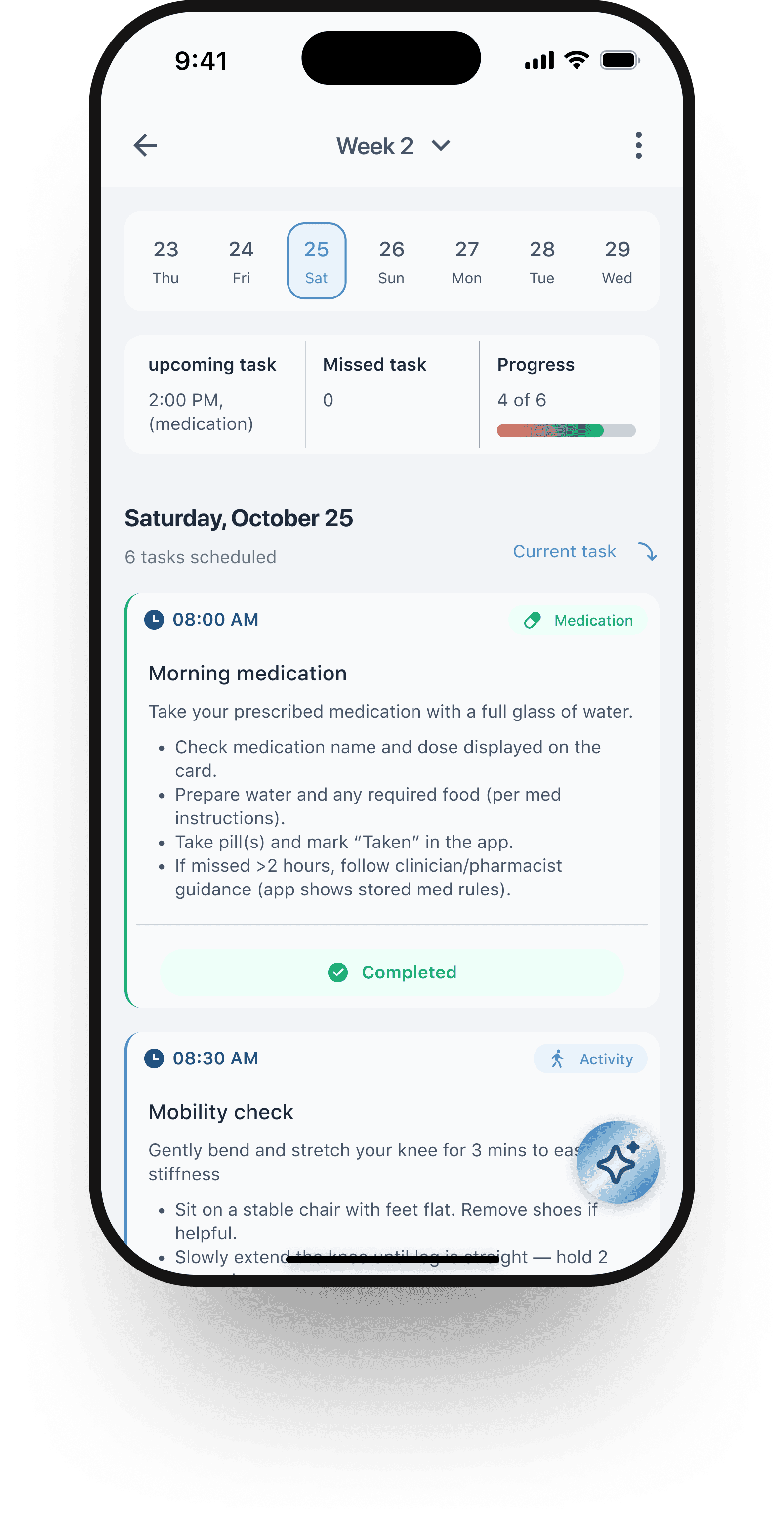 AI Assistant: Floating, contextual button for quick guidance, boosting engagement and adherence.