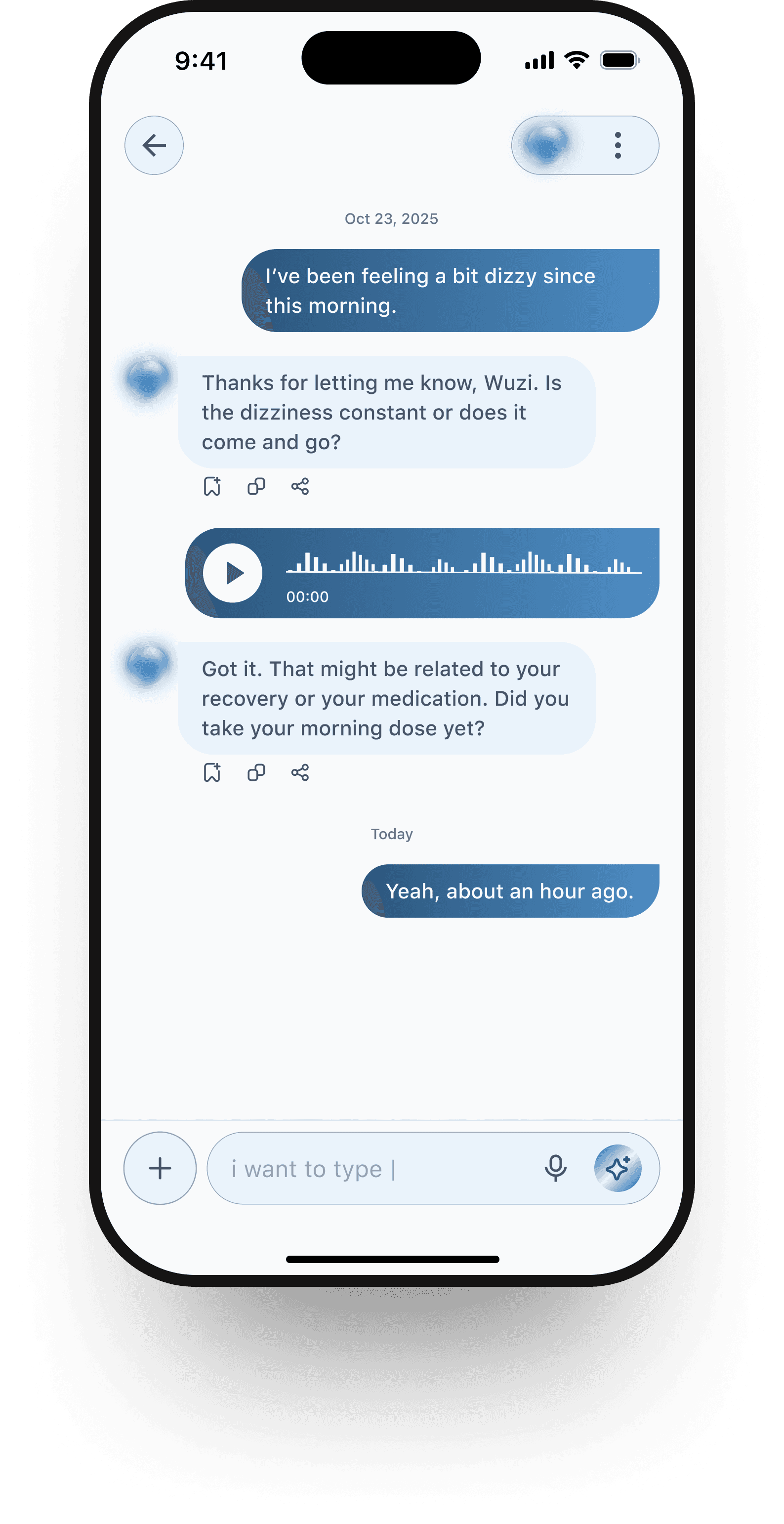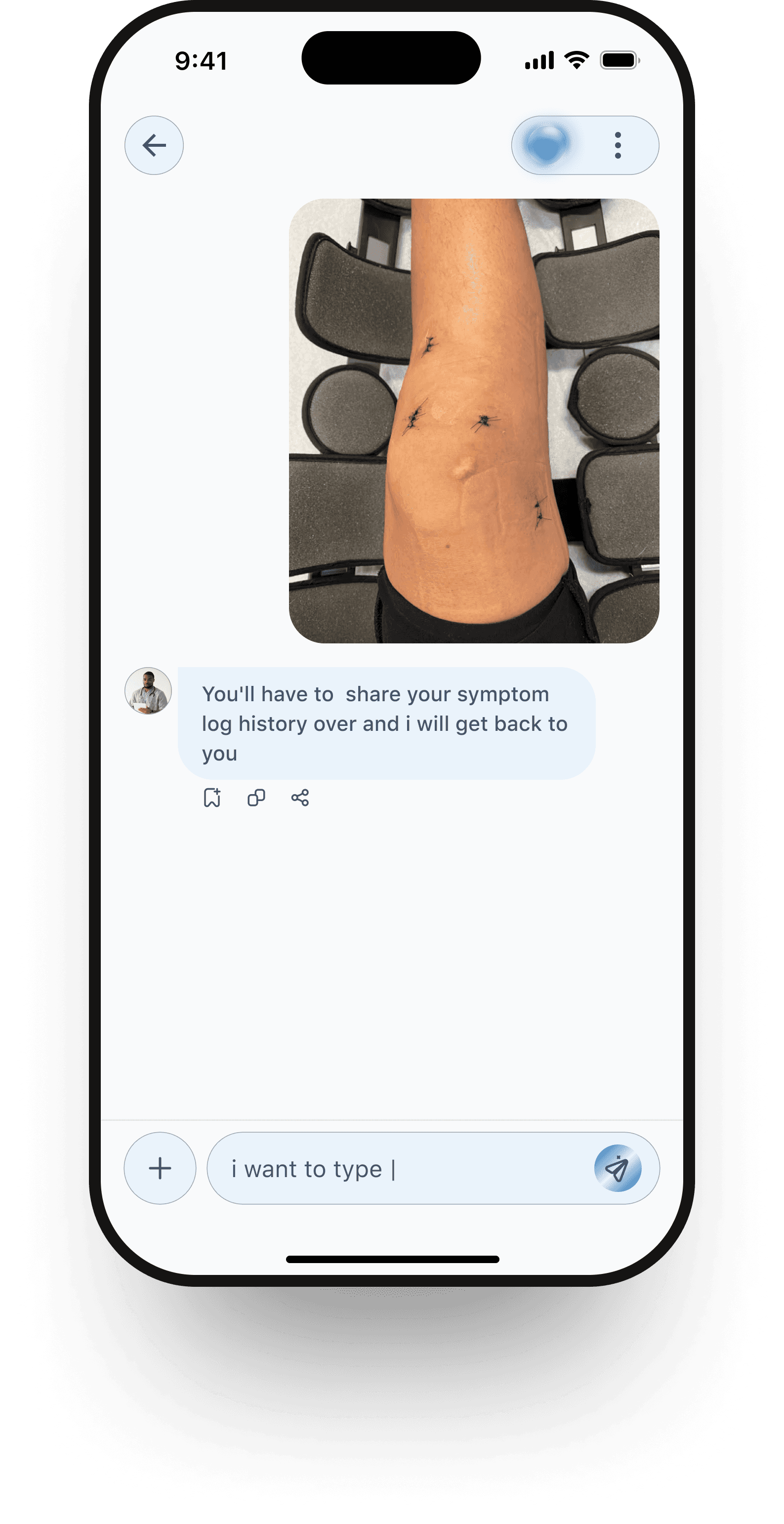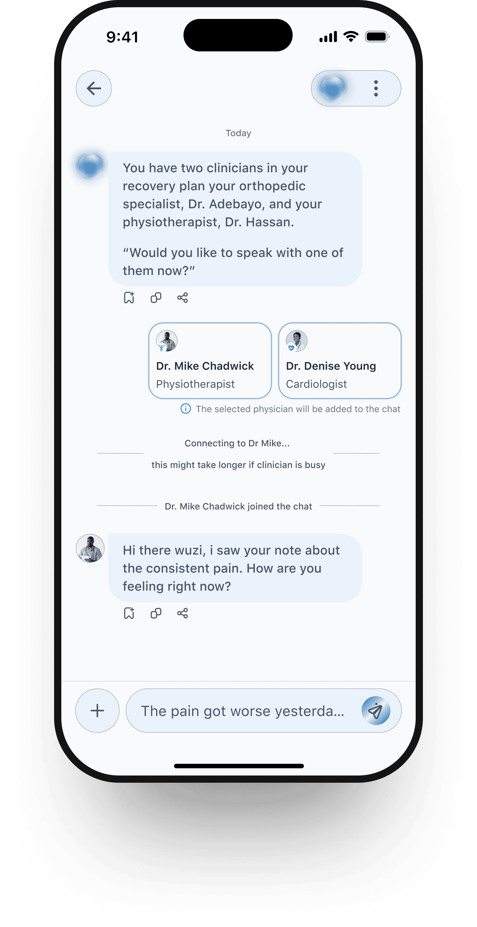 Patients can chat freely with the AI assistant for guidance, reassurance, or quick questions and doctors can be invited into the same conversation when needed.