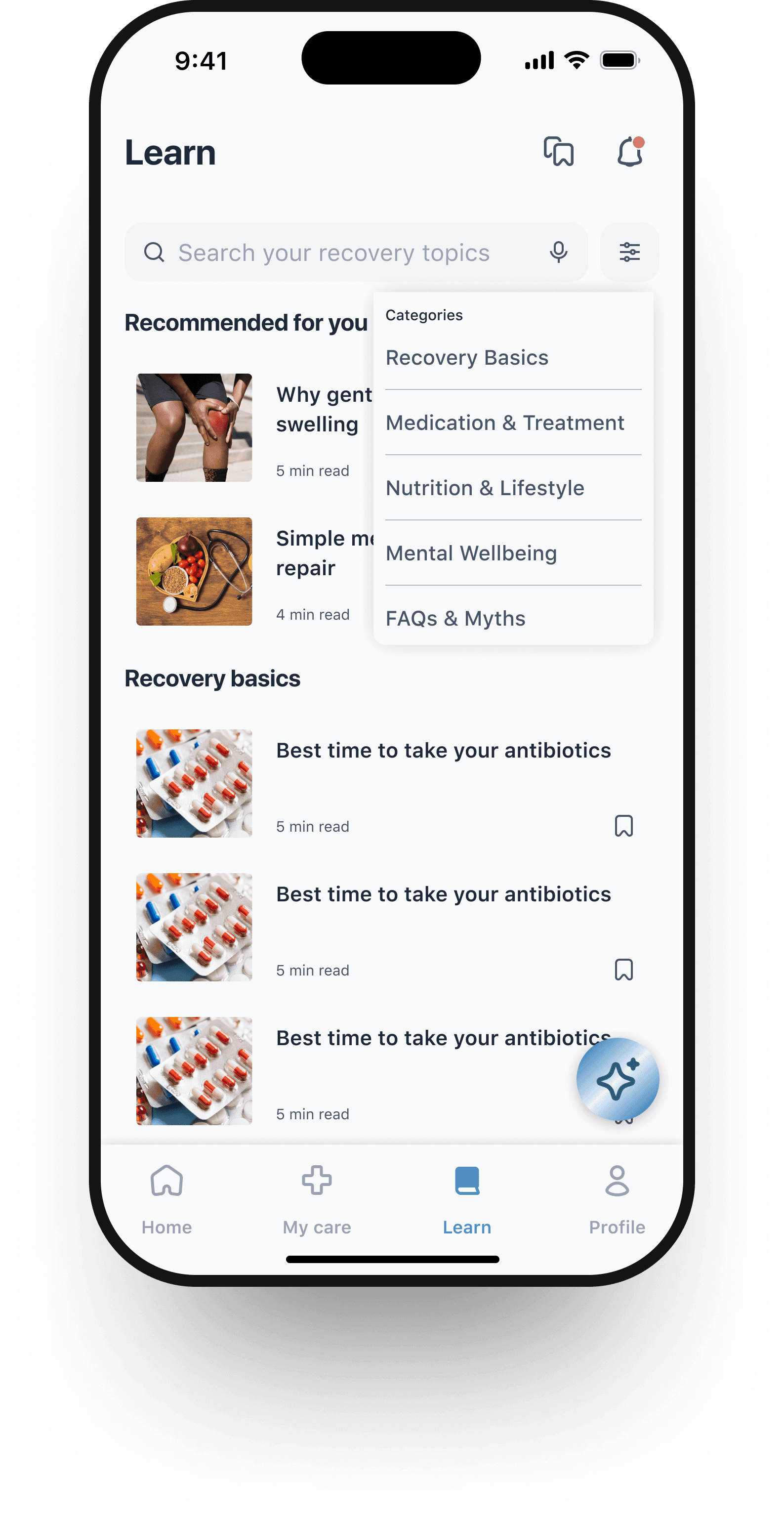 Learn Page: AI-curated content tailored to recovery plans, supporting knowledge and confidence.