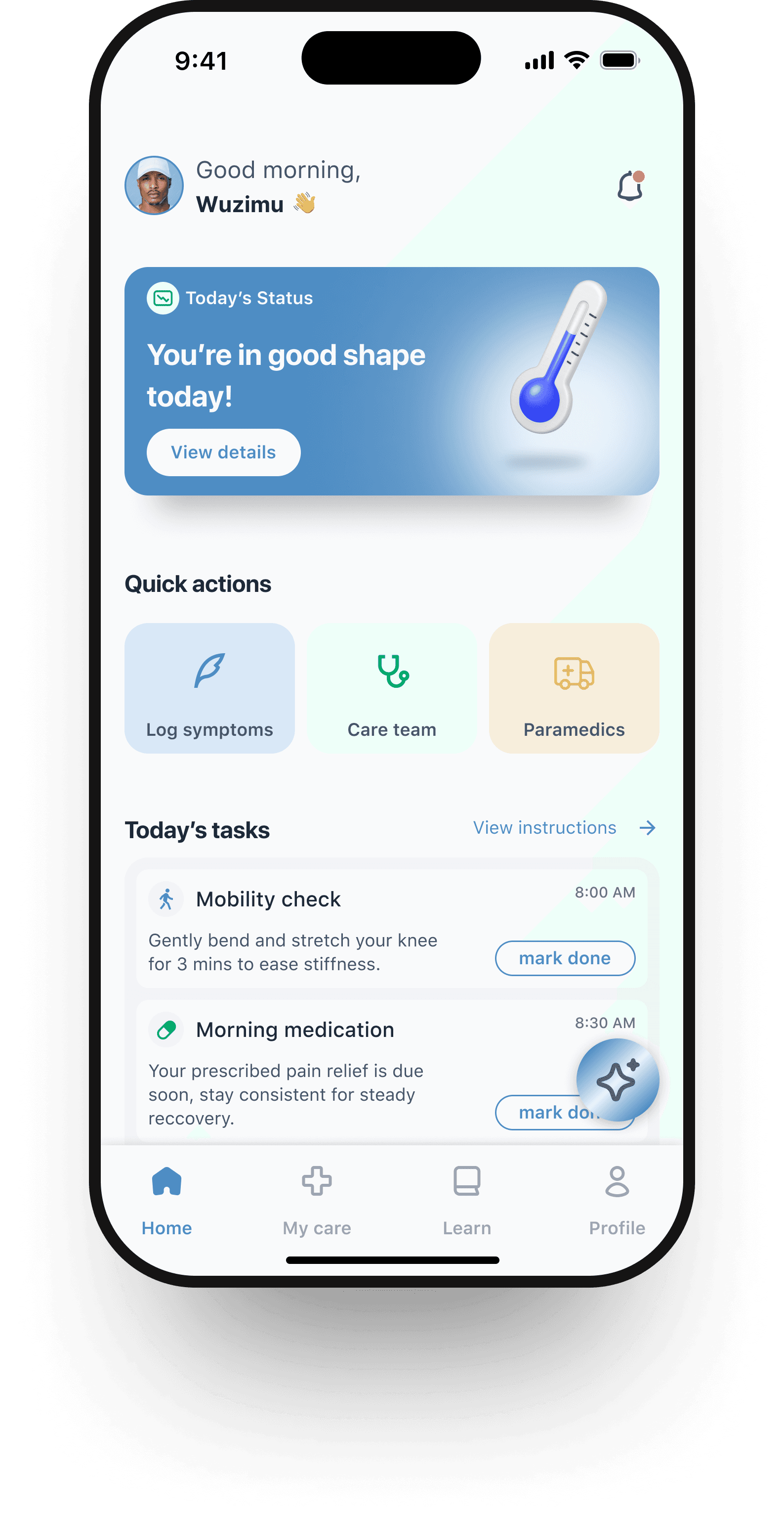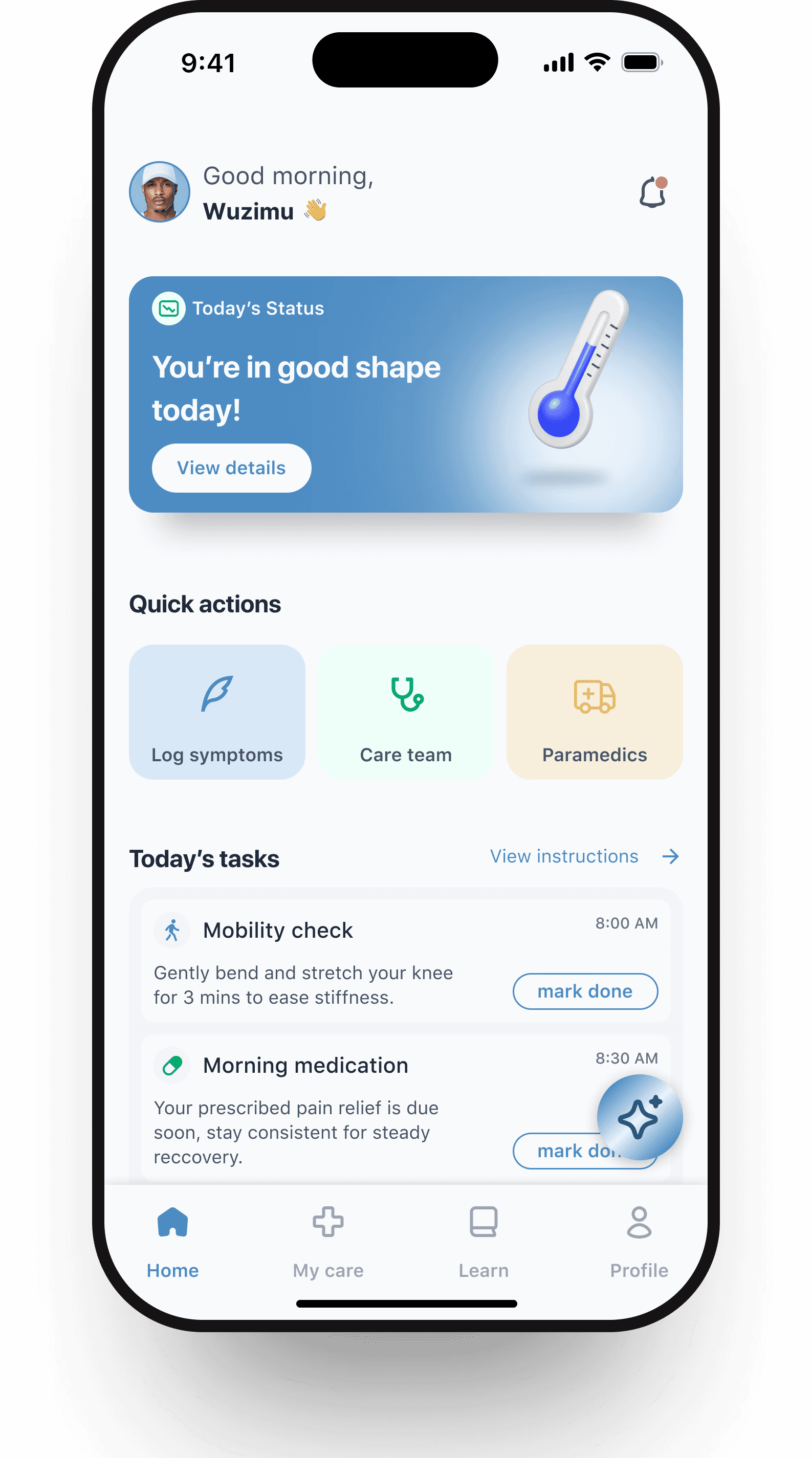 The home page shows the patientโs essential tasks for the day check-ins, and care actions in a simple, uncluttered layout.