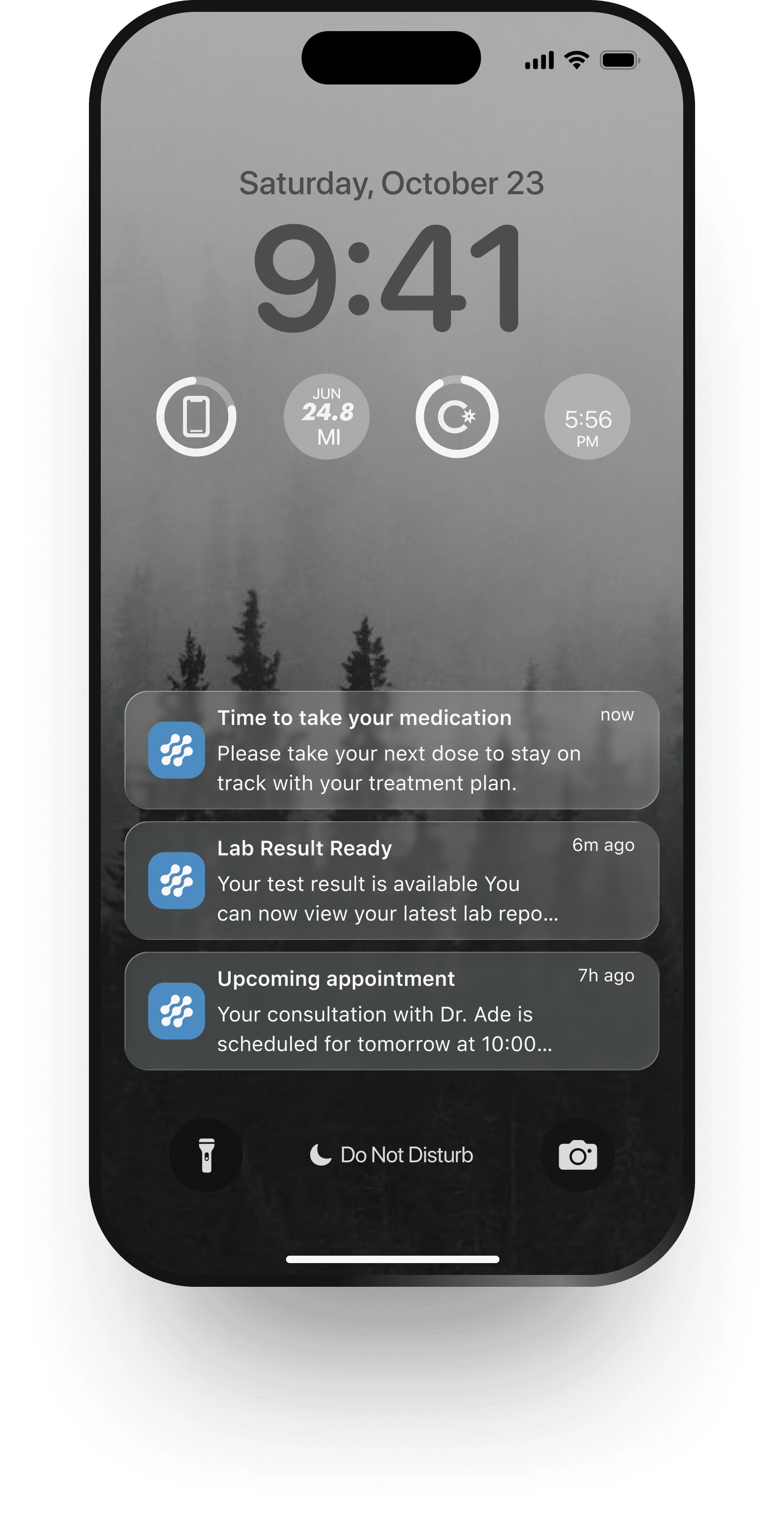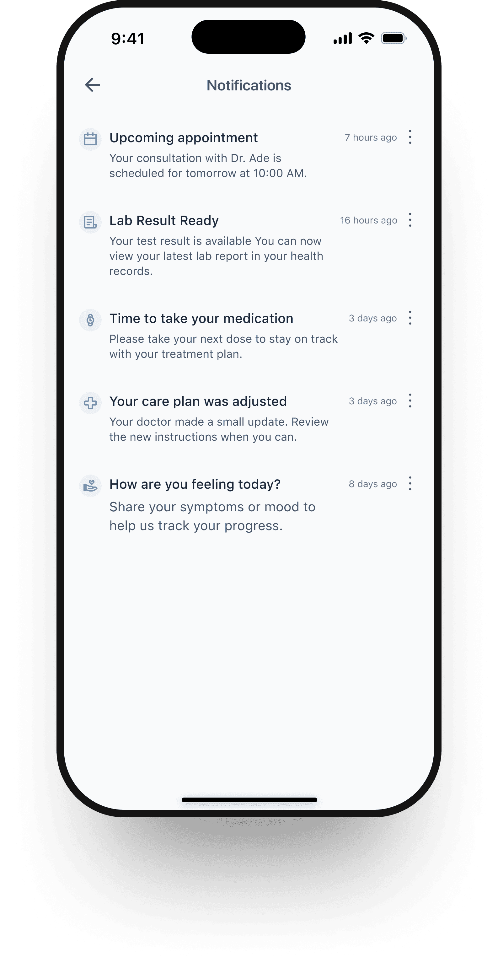 The app sends timely notifications for medication schedules, symptom check-ins, and upcoming appointments.
